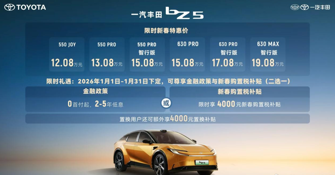 此外,另一款车型bZ5也给出了4000元的购置税补贴,显示出丰田在纯电赛道上“清仓式”反击的决心。