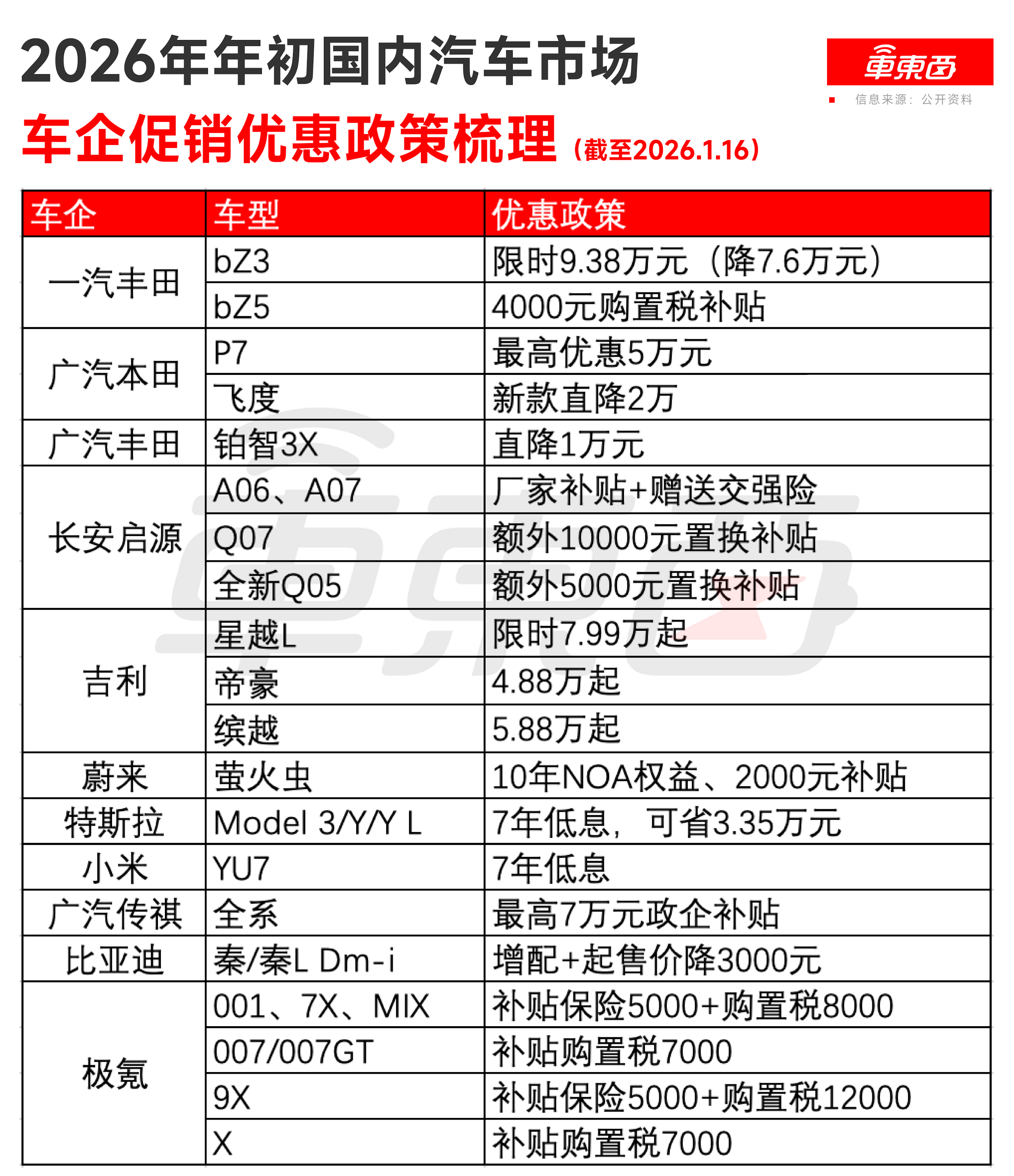 车东西1月16日消息,月初传统豪华大厂宝马“掀桌子”降价后,价格战进一步白热化了,截至目前又有10家车企超过20款主流车型火速跟进,形成了一波新的“降价潮”。吉利帝豪直接降至4.88万起售,小米YU7跟进了特斯拉的7年低息政策,广汽传祺撒下7万补贴大礼包,极氪更是保险补贴和购置税补贴一同拿出。