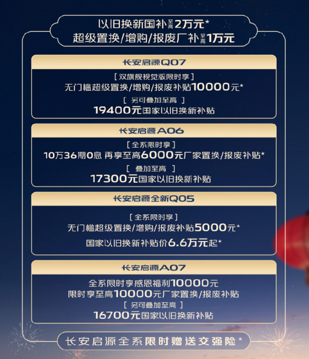 长安启源在本次价格战中则采取了极其细致的梯度补贴策略。针对主力轿车A06、A07,不仅提供厂家直接现金补贴,更创新性地加赠了交强险,有效降低了消费者的首付和落地成本。