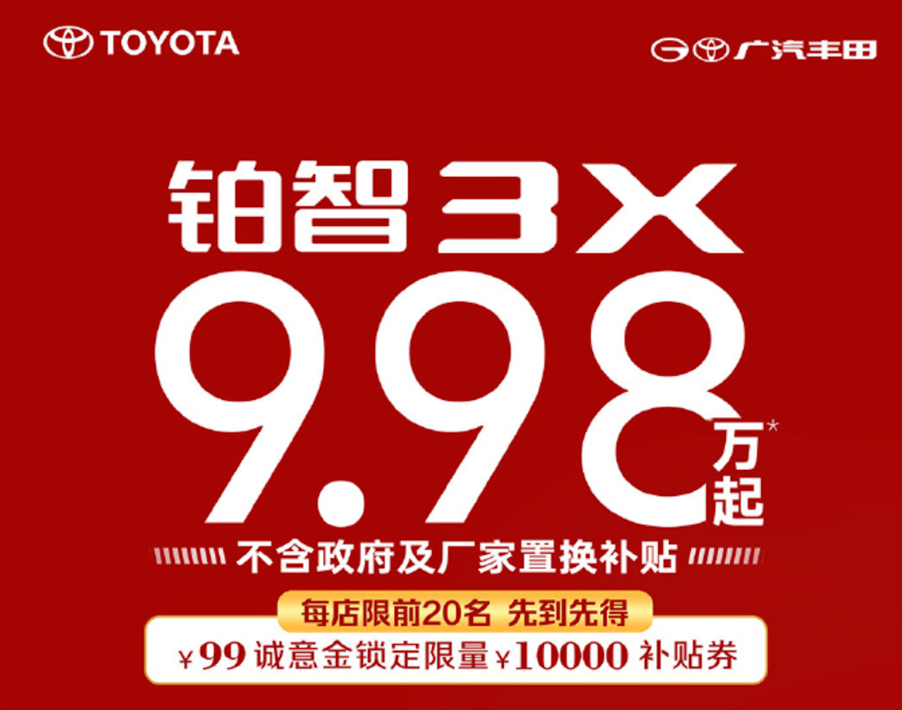 广汽本田与广汽丰田也紧随其后。广汽丰田旗下的铂智3X宣布直降1万元并辅以购置税补贴。